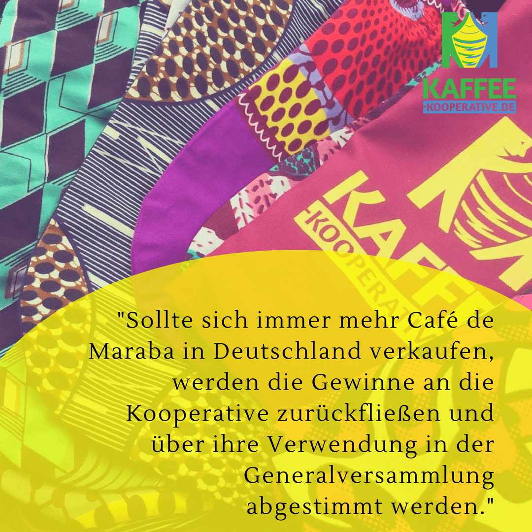 Bisher haben wir Überschüsse aus Rwashosccos Tätigkeit in Weiterbildungsmaßnahmen und Trainings gesteckt, damit wir weiterhin unsere Qualität verbessern, höhere Preise erzielen und unseren Mitgliedern mehr zurückgeben können. Sollte sich jedoch immer mehr Café de Maraba in Deutschland verkaufen, werden die Gewinne an die Kooperative zurückfließen und über ihre Verwendung in der Generalversammlung abgestimmt werden.
