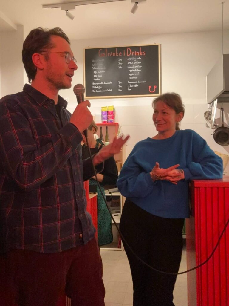 Nach Sophias Einführung übernahm Xaver das Mikrophon um in starken Bildern von den Anfängen der Kaffee-Kooperative zu erzählen: von der Gründung, dem gemeinsamen Reisen mit Allan Mubiru, seinem Mitgründer, der anlässlich der Vernissage und Grünen Woche ebenso vor Ort war.