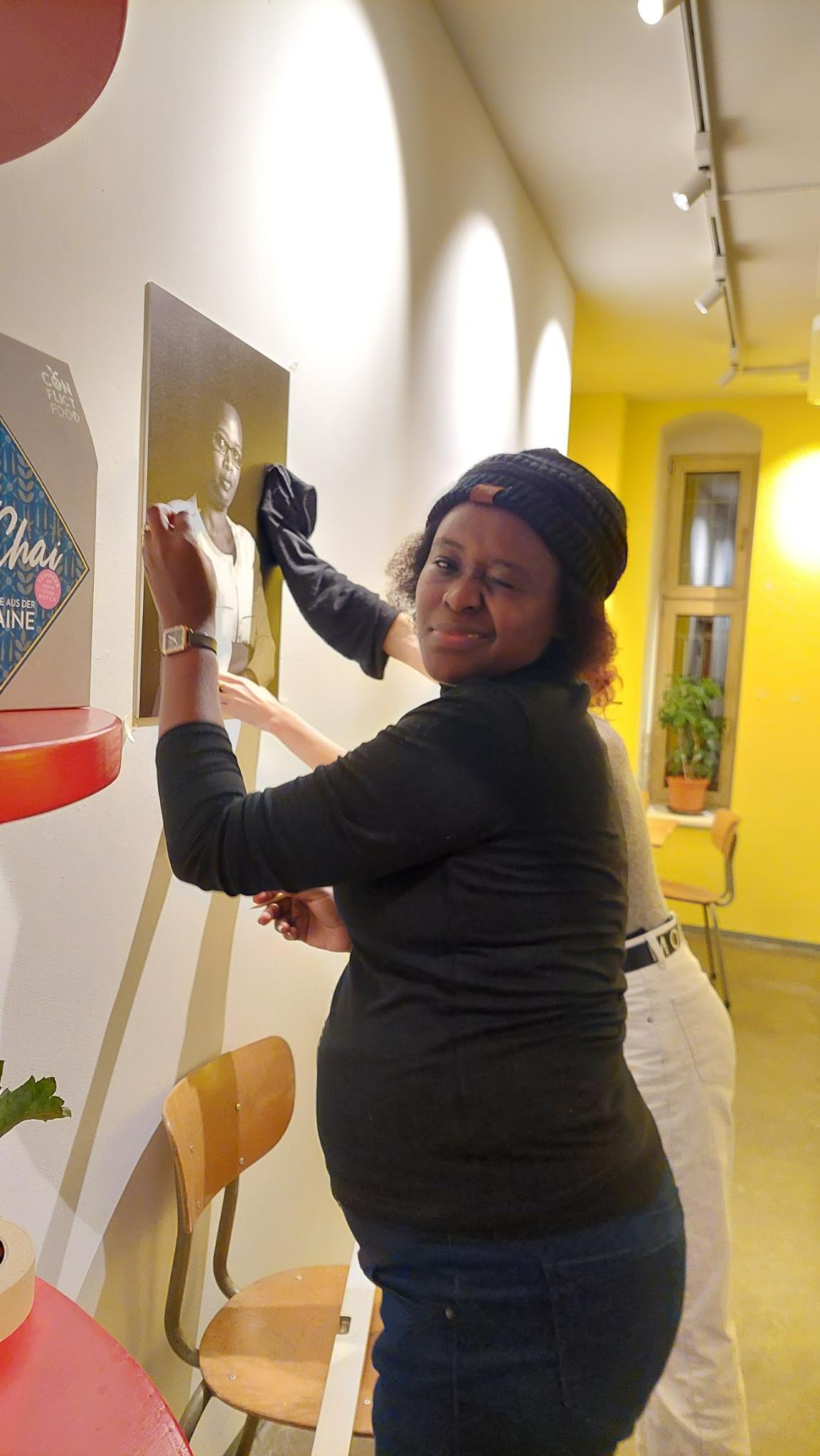 An einem wunderbar sonnigen Donnerstag Nachmittag fanden sich Tonja aus dem Marketing Team der Kaffee-Kooperative, Isa aus dem Sales Team und die Künstlerin Denyse dort ein, um die Ausstellung aufzubauen.