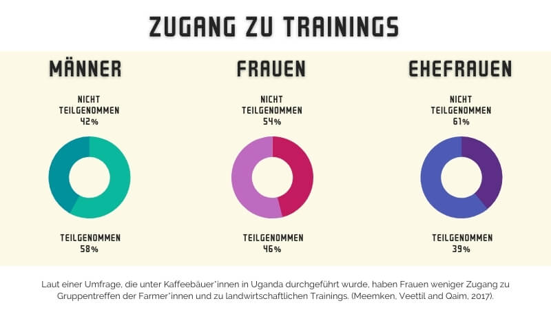 Ferner sind Frauen seltener an Entscheidungsprozessen beteiligt. Da häufig Männer die offiziellen Kooperative-Mitglieder sind und entsprechende Beiträge zahlen, wird den Frauen der Zugang zu Versammlungen und Weiterbildungsmaßnahmen verwehrt. So sind auch in Fairtrade zertifizierten Kooperativen nur 25 Prozent der Mitglieder Frauen (Quelle: Fairtrade Monitoring Report 2016). Dies führt zu weiteren Nachteilen, da so wichtige Informationen zu Anbaumethoden etc. nicht (immer) bei ihnen ankommen. Umfragedaten aus einer Kaffeeanbauregion in Uganda, die zwischen männlichen Bauern und ihren Partnern einerseits und weiblichen Bauern andererseits unterscheidet, weisen auf ein signifikantes Geschlechtergefälle hin.