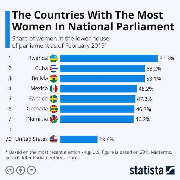 Dazu lohnt es sich, auf einige Indikatoren zu schauen. Im globalen Gender Gap Report des World Economic Forums belegte Ruanda 2020 mit 79,1 Prozent den 9. Platz – nach nordischen Ländern wie Island, Norwegen und Finnland sowie Nicaragua, Neuseeland, Irland und Spanien und vor Deutschland. Vor zwei Jahren belegte das Land sogar noch Platz 6 und ist das einzige afrikanische Land unter den Top 10.
