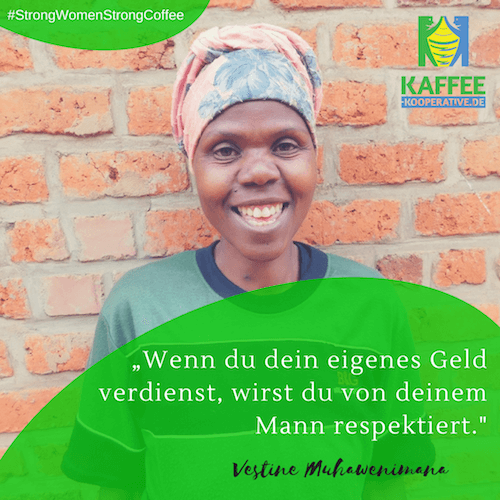 „Der Kaffee,“ sagt Vestine Muhawanimana, „bringt Unabhängigkeit. Auch ich kann nun zum Haushaltseinkommen beitragen. Einige Männer beschweren sich, dass ihre Frauen nichts tun, außer zu essen. Das kann mir nicht passieren. Wenn man sein eigenes Geld verdient, bedeutet das, dass dein Mann dich respektiert. Denn in einer Familie müssen beide Partner beisteuern.“