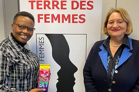 Die Partnerschaft mit TERRE DES FEMMES begann 2017. Während der Pause auf einer Fairtrade-Konferenz wollte es der Zufall, dass wir zusammen mit Christa Stolle – der Bundesgeschäftsführerin von TERRE DES FEMMES – an einem Tisch standen. Als wir ihr von Angeliques Arbeit mit Frauengruppen in den Kooperativen erzählten und der Idee, erstmalig eine eigene Kaffeemarke ganz aus Frauenhand zu schaffen, war das Interesse schnell geweckt. Seitdem unterstützt TERRE DES FEMMES Angelique’s Finest – Strong Women. Strong Coffee., indem sie auf allen Kanälen für den Frauenkaffee aufmerksam macht. Auch in der Bundesgeschäftsstelle in Berlin wird mittlerweile ausschließlich Angelique’s Finest getrunken. Im Januar 2020 besuchte Angelique sogar die Bundesgeschäftsstelle und berichtete, wie sie sich in einem von Männern dominierten Business durchgesetzt und es durch harte Arbeit von der Buchhalterin zur Geschäftsführerin von Rwashoscco geschafft hat!
